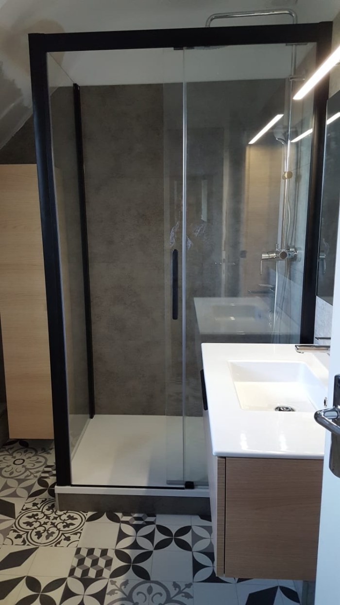 Nous sommes heureux du résultat. La porte de douche gère sa fermeture en douceur sans bruit, comme les portes des éléments de rangement. J’avais trouvé cela très chic et un peu forcé la main à Sylvie qui se serait contenté d’un système moins cher. Mais zut, nous avions hérité d’une salle de bain bricolée par les anciens propriétaires, et cela fait quinze ans que nous voulions la changer.