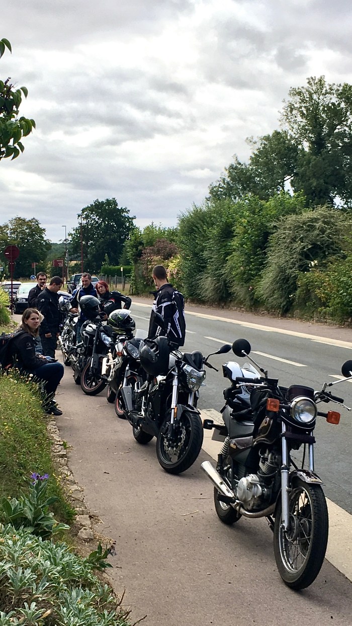 Departure from the house a little after 9:00 a.m. I find Lina and Alain in the Carrefour parking lot. Already a big surprise, Alain has a Yamaha 1300 cc. The organizing Facebook group is called « les 125cc de Normandie ». The fact that a (very) big cube ends up with 125ccs shows the openness of the group. It seems that the cohabitation between 125cc and big cubes is not always so easy.
