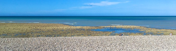 On repart direction Saint Valery en Caux. La route est droite, toute droite. Cela change des petites routes d’avant Dieppe. Nous restons derrière une machine agricole qui nous bouche la vue et il faut attendre un bon moment avant de pouvoir déboiter sans danger. À Saint-Valéry en Caux, nous posons les casques côte à côte sur le muret. La mer est un peu vert laiteux et les falaises de calcaire n’en finissent pas de rapetisser à perte de vue sur notre droite.