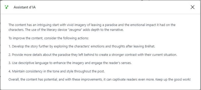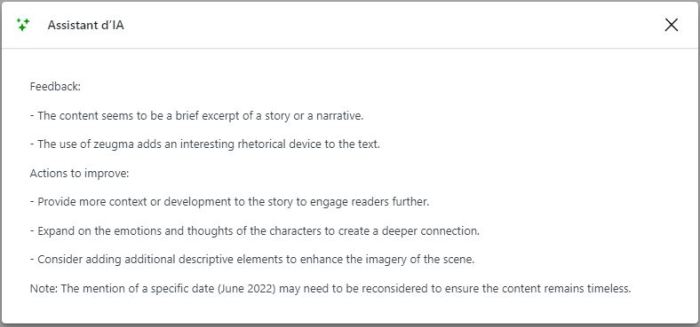 P.S. : lors de la publication de ce présent article, un assistant d’IA (que je suppose être Intelligence Artificielle) me propose des remarques pour améliorer mon texte. Très ouvert aux nouveautés, je l’essaie. Il me sort ce panneau :