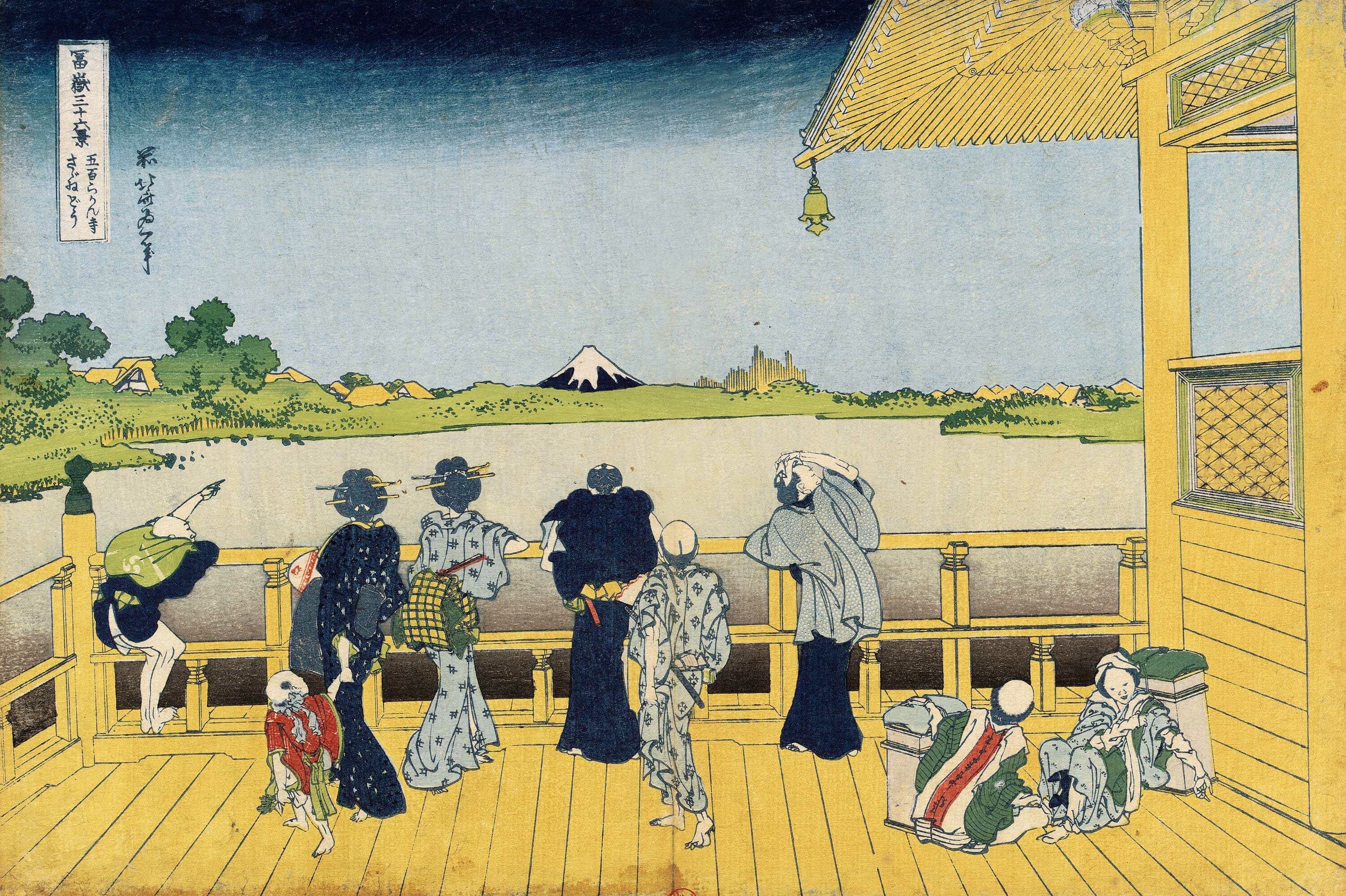 « Des pèlerins contemplent le paysage depuis la terrasse d’un temple à Edo. Ils admirent le mont Fuji enneigé au loin, tandis que les personnages de droite déposent leurs bagages. Le sommet de la montagne ressemble à la pointe d’une flèche au-dessus du personnage central. On distingue à droite du Fuji les hauts poteaux de bois d’un chantier de construction.