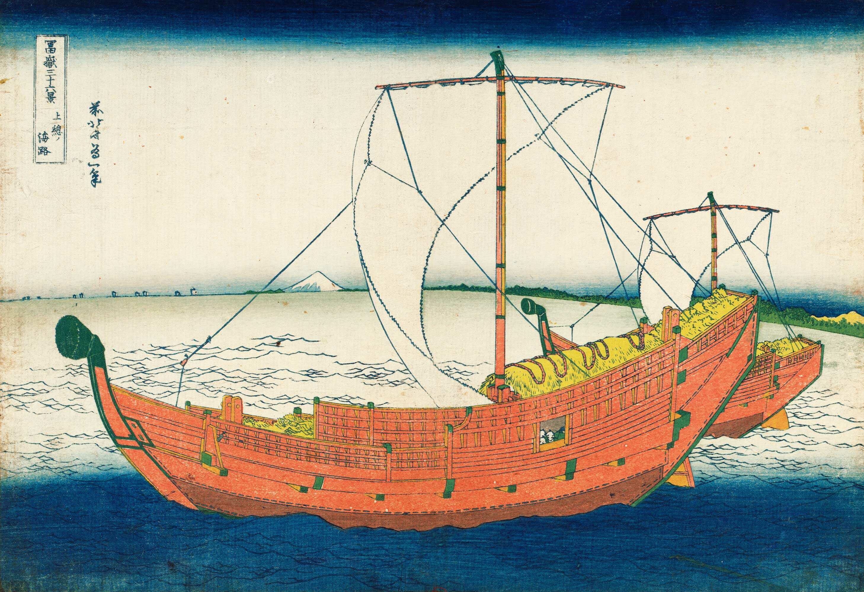 C’est le moment de transporter la récolte, en bateau. Deux bateaux, le premier cachant presque entièrement le second, dont on ne voit que la poupe, la voile et la « figure » de proue. Je ne sais pas ce qu’est la chose ronde que j’appelle la figure de proue…