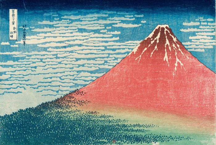 Série des 46 estampes du Mont Fuji par Katsushika Hokusai dit Hokusai 02/46 – Le Fuji rouge dans une embellie (Gaifû Kaisei, qui veut dire « Une brise légère par une belle journée« ) C’est le second dessin de la série de Katsushika Hokusai sur le mont Fuji. Nous utilisons souvent le terme Fuji Yama. Oubliez, c’est …